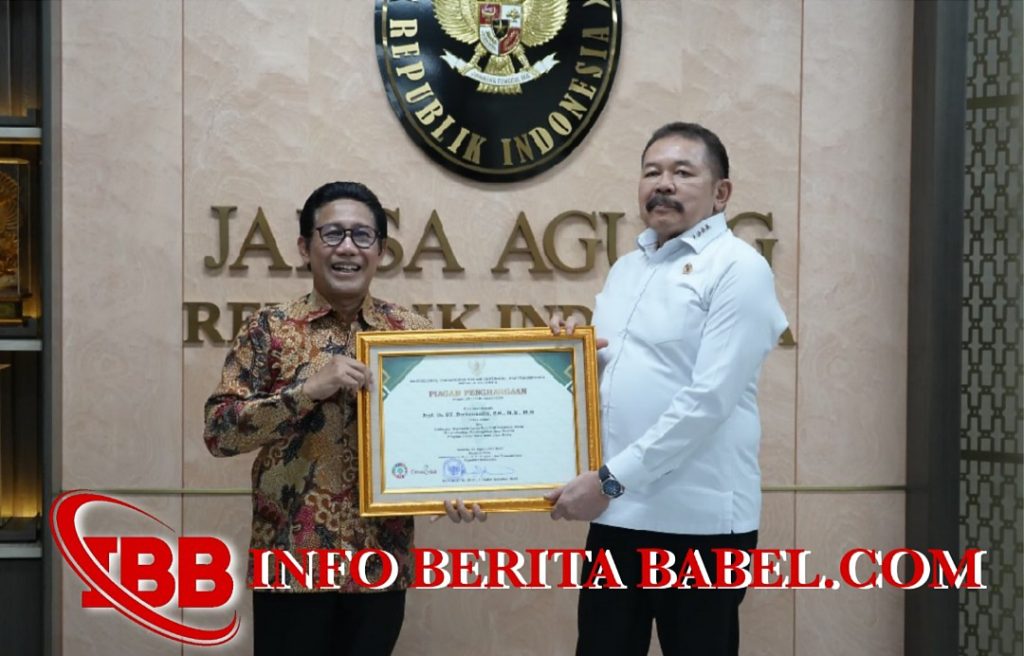 Jakarta, infoberitababel.com – Jaksa Agung ST Burhanuddin menerima piagam penghargaan dari Kementerian Desa, Pembangunan Daerah Tertinggal, dan Transmigrasi (Kemendes PDTT) atas Dukungan Kejaksaan Agung RI dalam Mensukseskan Pembangunan Desa Melalui Program Jaksa Garda Desa (Jaga Desa).