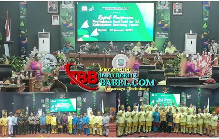Belitung Timur, infoberitababel.com – Rapat Paripurna Hari Jadi ke-22 Kabupaten Belitung Timur (Beltim) yang digelar DPRD Kabupaten Beltim dihadiri Bupati Beltim Burhanudin dan Wakil Bupati Beltim Khairil Anwar di Gedung DPRD Kabupaten Beltim, Senin (27/01/2025).