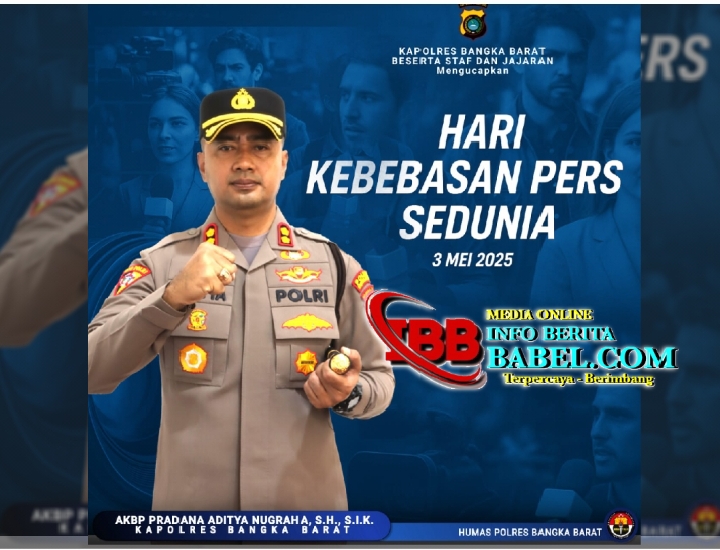 Bangka Barat, infoberitababel.com – Dalam rangka memperingati Hari Kebebasan Pers Sedunia, Kapolres Bangka Barat AKBP Pradana Aditya Nugraha, S.H., S.I.K., bersama staf dan jajaran kepolisian mengucapkan selamat kepada seluruh insan pers di Indonesia. Sabtu (03/05/2025).