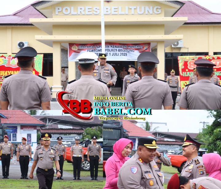 Belitung, infoberitababel.com – Polres Belitung menggelar Upacara Kenaikan Pangkat Pengabdian kepada anggota Polri periode 01 Juli 2025. Kegiatan yang dimulai pukul 07.00 WIB ini berlangsung khidmat di Halaman Apel Polres Belitung, dipimpin langsung oleh Kapolres Belitung AKBP Sarwo Edi Wibowo, S.I.K. Senin (30/06/2025).