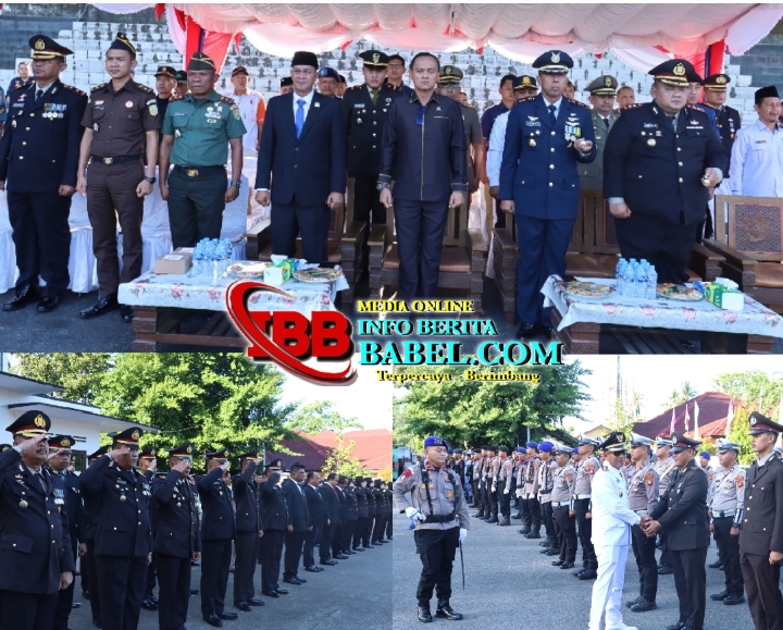 Bupati Belitung, H. Joni Alamsyah Hidayat, S.Sos, bertindak selaku Inspektur Upacara, memimpin langsung rangkaian kegiatan. Sementara Komandan Upacara dijabat oleh IPDA Dedy, S.H. Peserta yang hadir mencerminkan kebersamaan seluruh komponen, mulai dari Pejabat Utama Polres Belitung, perwakilan TNI (Kodim, AL, Lanud), instansi terkait (PM, Dishub, Pol PP), hingga unsur relawan seperti Orari/Rapi, Senkom, dan Pramuka.
