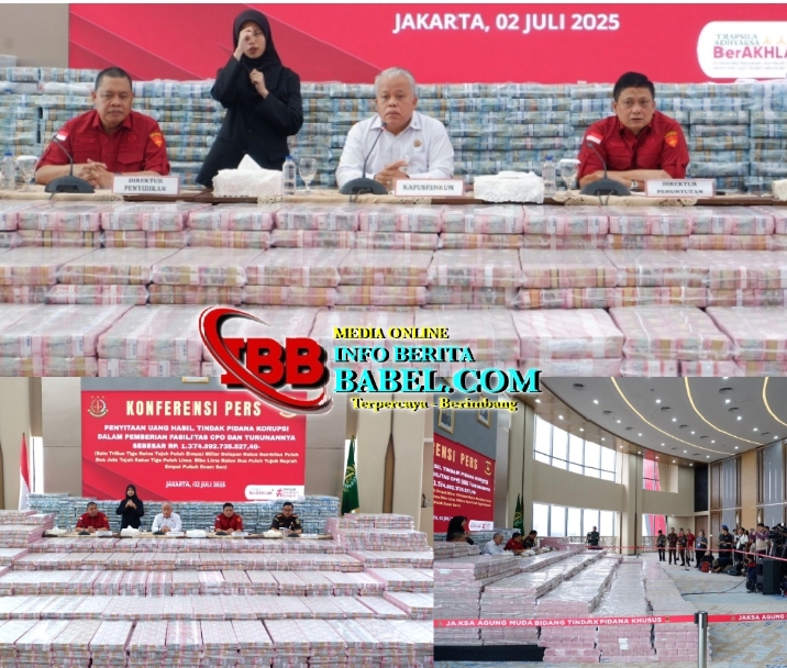 Jakarta, infoberitababel.com – Tim Penuntut Umum dari Direktorat Penuntutan pada Jaksa Agung Muda Bidang Tindak Pidana Khusus (JAM PIDSUS) kembali melakukan penyitaan pada tingkat penuntutan terhadap uang senilai Rp1.374.892.735.527 (satu triliun tiga ratus tujuh puluh empat miliar delapan ratus sembilan puluh dua juta tujuh ratus tiga puluh lima ribu lima ratus dua puluh tujuh rupiah) terkait perkara tindak pidana korupsi fasilitas ekspor Crude Palm Oil (CPO) dan turunannya pada industri kelapa sawit tahun 2022 atas nama 12 Terdakwa Korporasi. Rabu (02/07/2025).