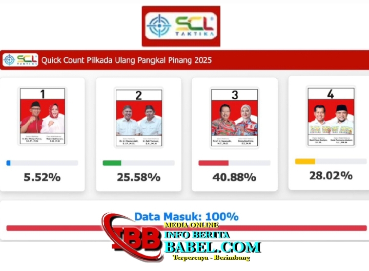 Pangkalpinang, infoberitababel.com – Lembaga survei SCL Taktika merilis hasil hitung cepat (quick count) Pemungutan Suara Ulang (PSU)...