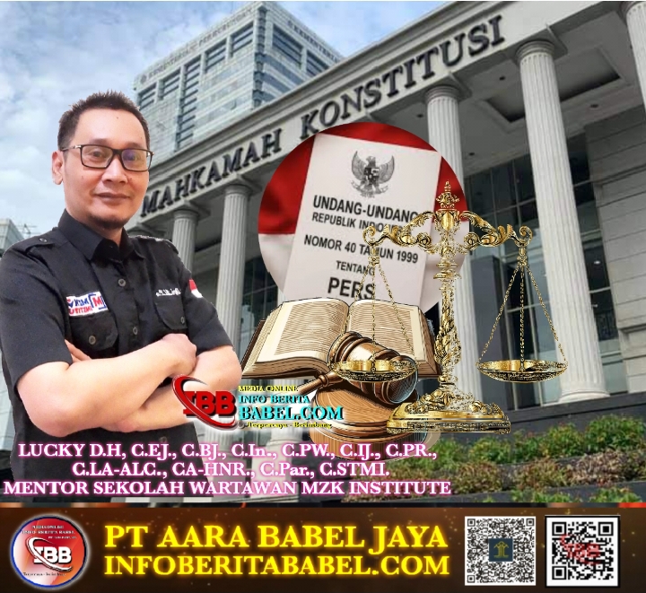 Bangka Belitung, infoberitababel.com – Lucky D.H, C.EJ., C.BJ., C.In., C.PW., C.IJ., C.PR., C.LA-ALC., CA-HNR., C.Par., C.STMI., selaku Mentor Sekolah Wartawan MZK Institute dan Pimpinan Redaksi di beberapa Media Online, menyoroti secara serius hasil Putusan Mahkamah Konstitusi yang mengabulkan sebagian permohonan uji materi terhadap Pasal 8 Undang-Undang Nomor 40 Tahun 1999 tentang Pers. Selasa (20/1/2026).